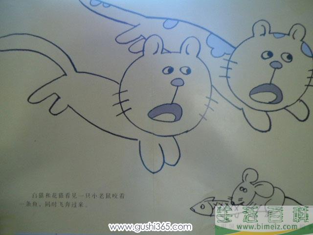白猫和花猫看见一条小老鼠咬着一条鱼,同时飞奔过去。