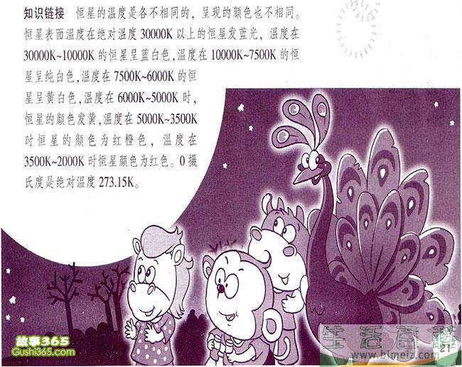 他们想不明白,每个人又亲自用望远镜看了一遍,都找不出缘由。就在这时,金孔雀从天上飞来,说道:“哈哈,这没什么好奇怪的,星星的颜色是跟它们表面的温度不同有关的,不信,你们跟我来,我带你们看一样东西!”