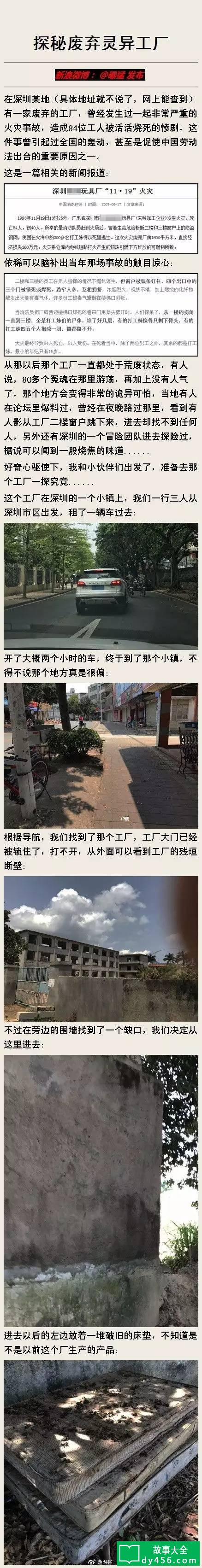 在深圳某地,有一个被废弃的工厂,因为这里曾发生过一起严重的火灾,吞噬了80多条鲜活的生命而被废弃,从那以后这里就有了灵异传言,有人说走夜路时看到里面有人影跳楼,进去一看却什么都没有,还有人说很多年后进去里面依然能闻到一股烧焦的味道......好奇心驱使下我和朋友亲自驾车前往探秘......